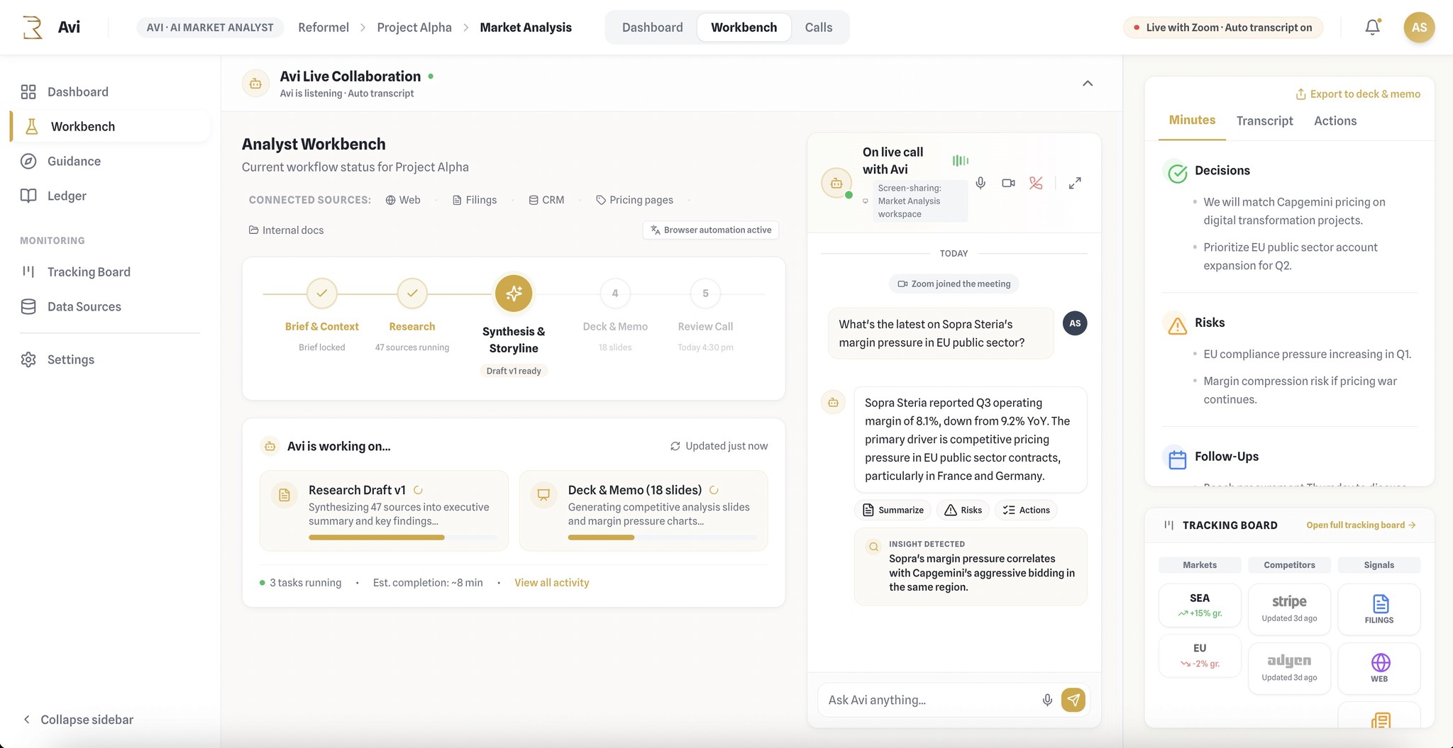 Avi automates grunt work so analysts spend time on framing, client conversations, and judgment calls.